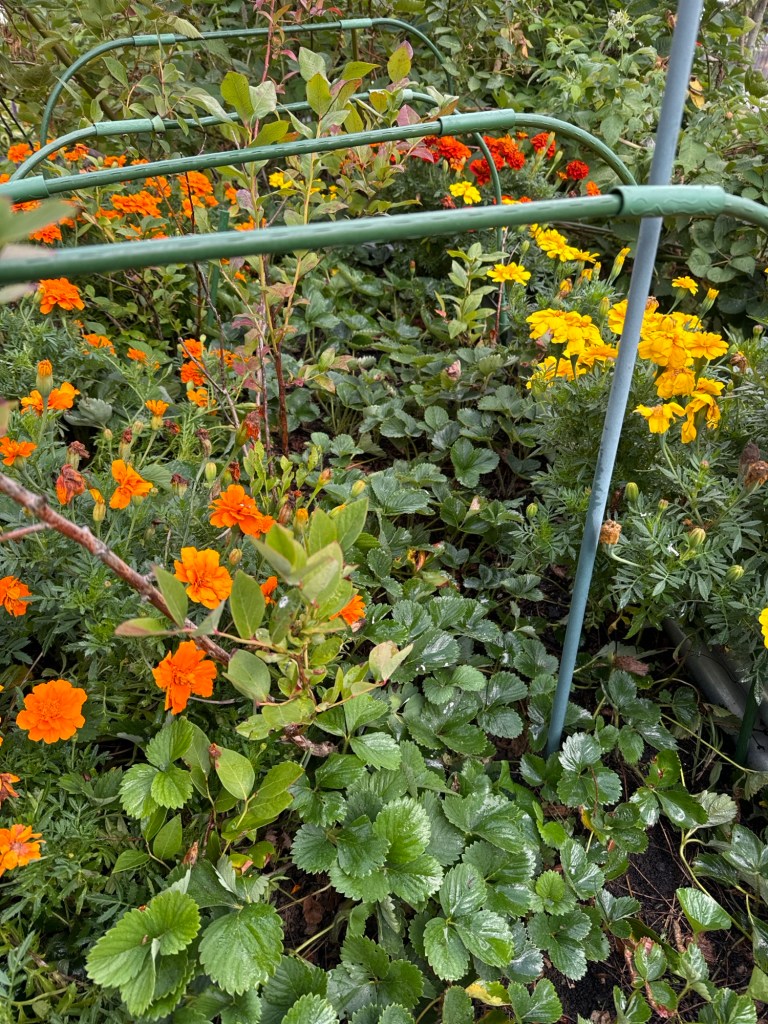 This garden is a few years old and well established with blueberries and strawberries. The only problem despite adding a plant which was supposed to keep the bunnies away has not. In 3 years we have yet to claim a single berry for ourselves….. Tried netting but it caught birds sadly. It was a no go. Now the birds dive down to claim the blueberries just as they ripen.