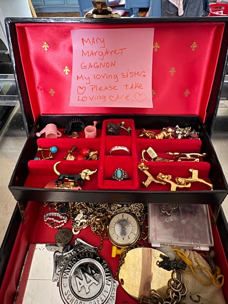 Sister in law gave me my deceased sister’s belongings to me. Another sister had said she wanted them but they were given to me instead. There isn’t any item of value. As we grew Mary and I were always given the same exact item. Dad would get each a bracelet engraved. Mine was silver and Mary’s was gold.