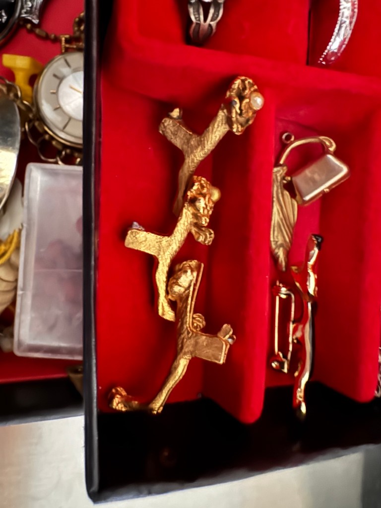 What gives me a real shiver is the golden little legs which were on a jewelry box belonging to mother. Two were given to each. Now I hold all 4. there are only 3 in the picture…. Oops.